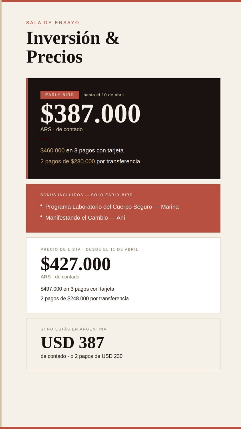 Sí. SALA no reemplaza lo que ya estás construyendo — lo potencia. Trabaja la capa que ningún otro programa toca: cómo tu cuerpo y tu voz comunican todo lo que ya sabés. De hecho, muchas participantes arrancan SALA en paralelo a otros procesos y notan que todo lo que aprenden en otras mentorías les sale más natural cuando lo tienen que comunicar.