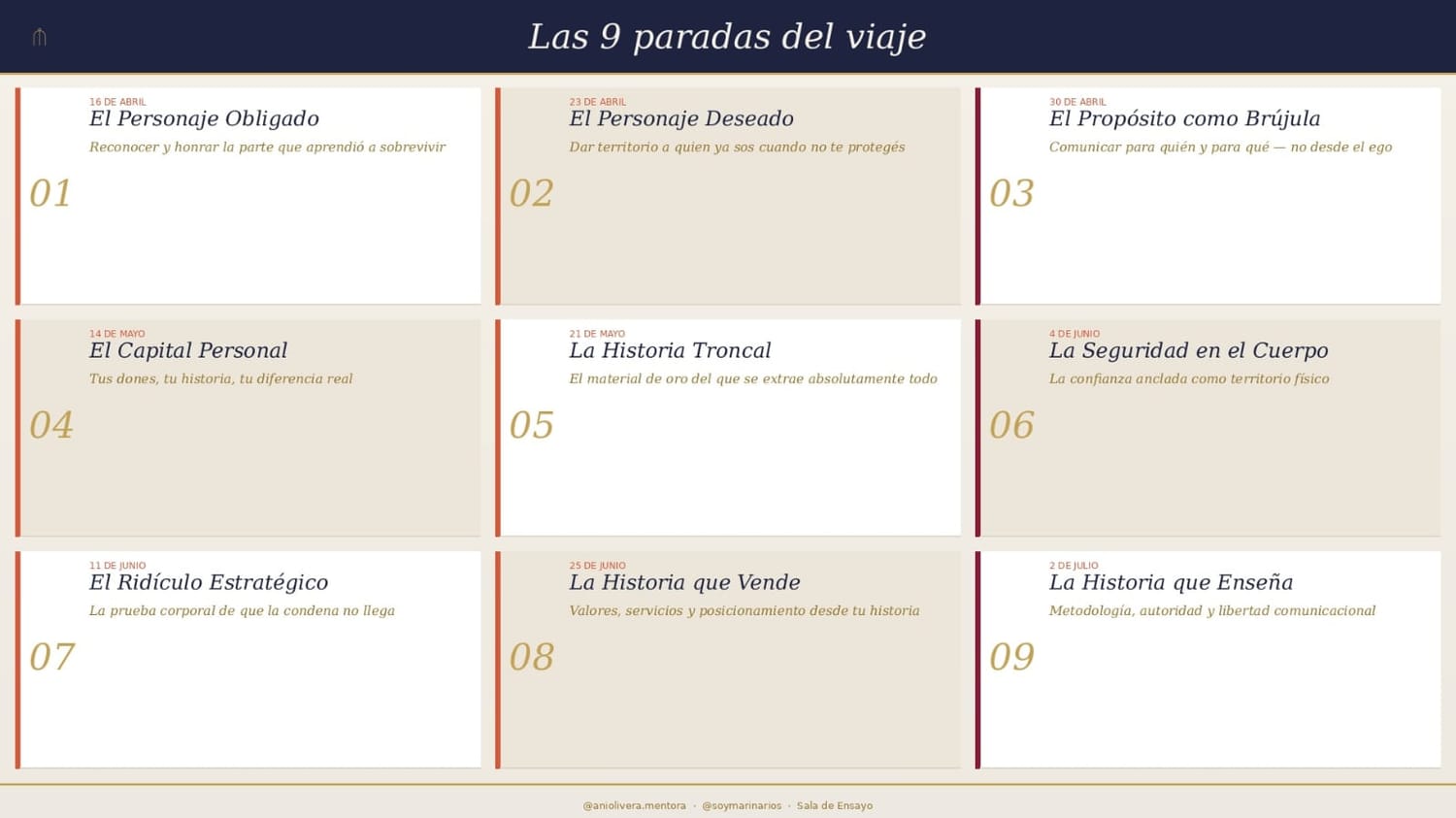 En 9 encuentros en vivo vas a construir tu historia de marca, encarnar tu personaje deseado y practicar la exposición real hasta que el cuerpo sepa qué hace, por experiencia, no por pensarlo.